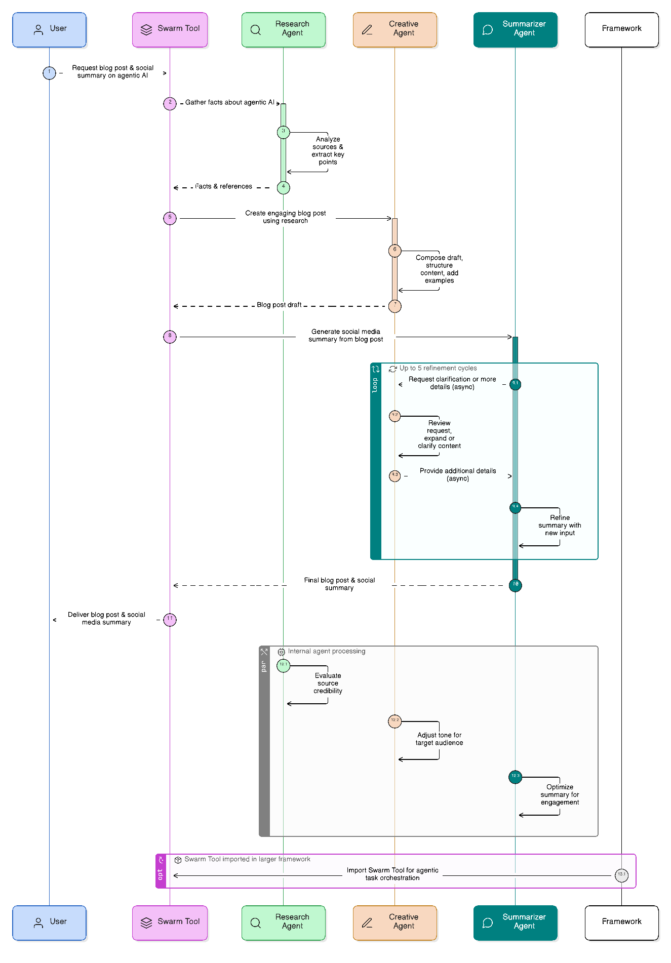 Dynamic Collaboration: Agents communicate and collaborate without a central orchestrator.